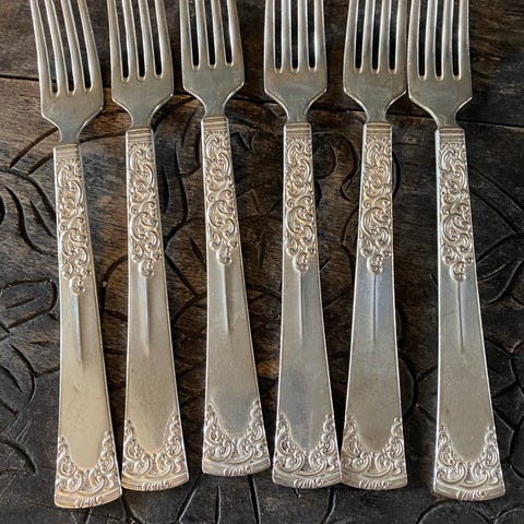 Metallet er sølvplett på nysølv, en kvalitet som var svært vanlig i bryllupsgaver på denne tiden. Kurven har naturlig patina etter alder og bruk. Jeg har vasket kurven grundig og bleknet innsatsen merkbart bra. Jeg har med overlegg bevart mesteparten av patina'n i sølv-finishen, fordi denne kurv simpelthen er rålekker med dét sort-gyldne ytterplagget på.