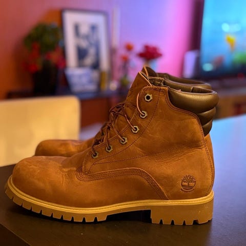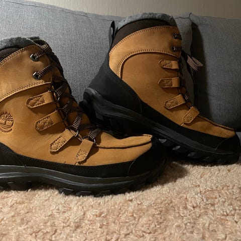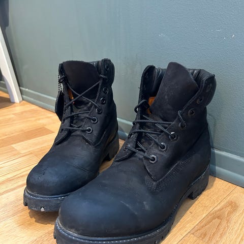 Timberland's kjente boots i sort, vanntett nubuckskinn i størrelse 42. Svart nubuckskinn med polstret ankelkrage for ekstra komfort. Støvlene har skinn/tekstilfôr innvendig og klassisk Timberland-logo på siden. Egnet som varme og robuste vinterstøvler til hverdagsbruk og uteaktiviteter.