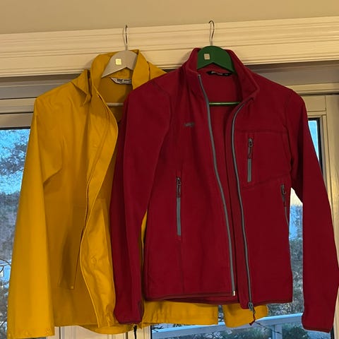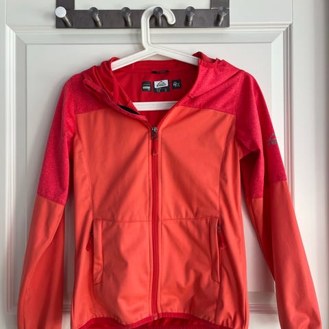 2: Skogstad fleecejakke i friske farger, raud og oransje. Har lommer med glidelås og mulighet for stramming nederst på begge sider. Fin som mellomlag eller åleine når våren kjem.