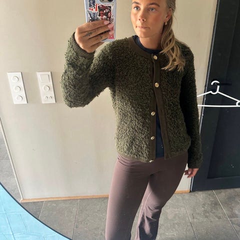 Pen sjøgrønn cardigan, den er pent brukt og komfortabel i 78% radon og 22% polyester.