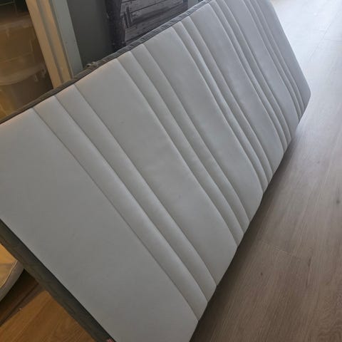 Jysk overmadrass i hvit farge. Memory foam madrass og trekk i 100%polyester. Heter “Gold -T25” tror jeg. Har noen mørke skygger/flekker her og der, og noen områder med nupper. Nyvasket trekk!