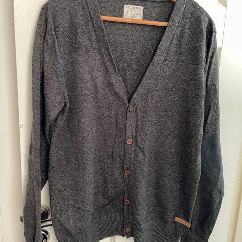 80% ull, 20% polyamide, tettvevd og varm. Klassisk kardigan med to sidelommer og trukknapper, fra H&M. Farge er mellom sort og koksgrå. Meget pent brukt.