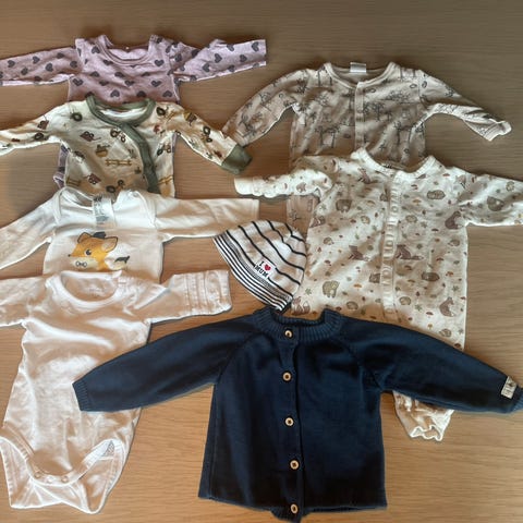 Stor pakke med ulike plagg, mange er helt nye men uten lapp. Størrelser 50 (1 sett), 56 og noen i 62. Flere luer følger også med.