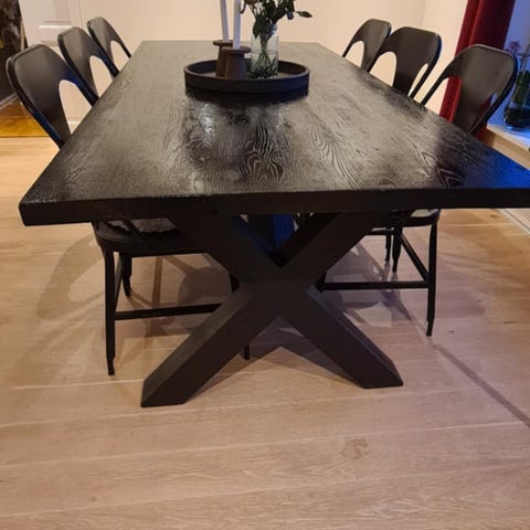 I pakkepris selges spisebord og 8stk spisestoler. Både bord og stoler bære preg av bruksslitasje, så selges som de er (se vedlagte bilder for merker på bordoverflate og stoler).
