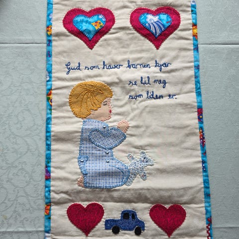 Håndlaget veggteppe for barn med brodert kveldsbønn og applikasjon av knelende barn. Motivet er omgitt av kant i flerfarget stoff og dekorative hjerter i kontrastfarger. Teksten er sydd med blå tråd på lys bakgrunn. Veggteppet har oppheng øverst som gjør det enkelt å henge på vegg, for eksempel på barnerom. Egnet som dekorasjon og som del av kveldsritualer for barn.