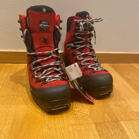 Alfa fjellstøvler i rødt med svart såle og forsterkninger. Støvlene har høyt skaft med kraftig snøring og metallhekter. Grovmønstret yttersåle gir godt grep på variert underlag. Egnet som tur- og fjellstøvler til bruk i skog og fjell. Kjønn ikke spesifisert.