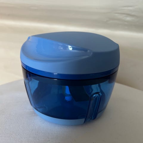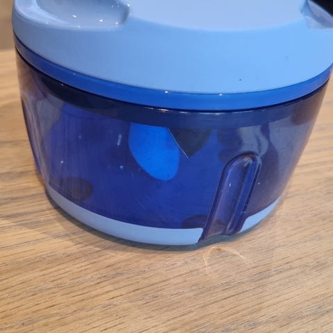 Tupperware manuell hakker i plast med kapasitet på 300 ml. Beholder i mørk blå transparent plast og lokk i lys blå plast. Utstyrt med innvendig knivinnsats for hakking av for eksempel grønnsaker, urter eller nøtter. Egnet til bruk på kjøkkenet for enkel og rask manuell hakking av mindre mengder råvarer.
