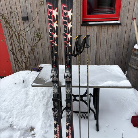 Völkl Unlimited AC alpinski i lengde 163 cm. Skiene har en konstruksjon med composite-kjerne. Mål på skiene er ca. 116 mm i tupp, 70 mm på midten og 103 mm i bakkant. Leveres med monterte Marker-beslag/bindinger (nøyaktig modell ikke spesifisert). Fargekombinasjon hovedsakelig rød og hvit. Egner seg som carvingski til bruk i alpinbakke. Staver som vises på bildene følger med.