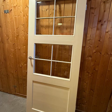Flott innerdør med blyglass. Har kjøpt den nylig for det dobbelte på Finn, men så viste det seg at den var hengslet feil vei i forhold til der vi skulle ha den.