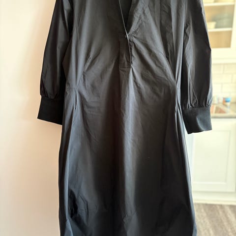 Kjolen er i ett myk og behagelig stoff, som ligner mest på poplin. Har ikke brukt den fordi den er for stor. To stikklommer. Mykt strikk på armene. Ny pris ca 1100 kr.