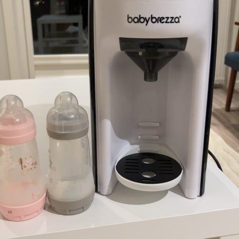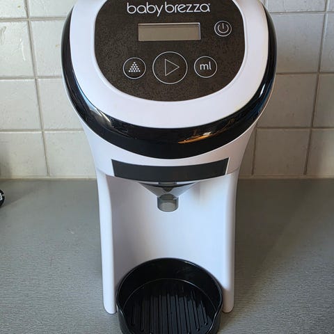 Baby Brezza Formula Pro melkeerstatningsmaskin i hvit og svart utførelse. Maskinen blander morsmelkerstatning og vann automatisk direkte i tåteflasken. Den har beholder på toppen for pulver, vannbeholder, dryppbrett og betjeningspanel foran. Egnet til tilberedning av tåteflasker til spedbarn og småbarn. Passer på kjøkkenbenk eller annen benkeplass med tilgang til strømuttak.