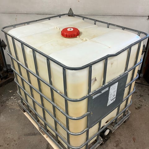 IBC tank plastbeholder med stålgitter på ca. 1000 liter. Beholderen er laget av plast og er omkranset av et ytre stålgitter for stabilitet og beskyttelse. Den har påfyllingsåpning på toppen og tappemulighet i bunnen. Egner seg til lagring og transport av væsker der IBC-løsning er hensiktsmessig, for eksempel i industri, landbruk eller andre tekniske formål, avhengig av tidligere og planlagt innhold.