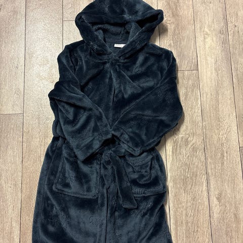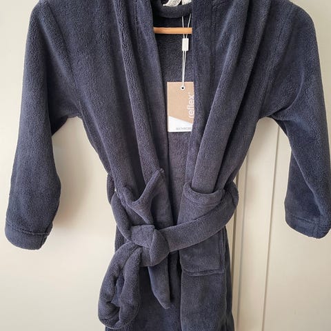 Reflex morgenkåpe for barn i størrelse 116. Morgenkåpen er blå og laget av 100 % polyester. Modellen er unisex og har hette, knytebelte i livet og påsydde lommer foran. Kan maskinvaskes på 30 grader ifølge vaskeanvisningen.
