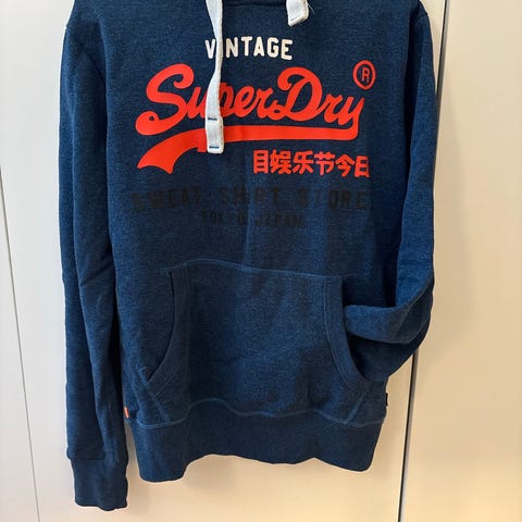 Superdry hettegenser for herre i størrelse S. Stor størrelse så mer en mellomting mellom M og L, Genseren er blå og laget av bomull. Den har hette med snøring, stor Superdry-logo på brystet og kengurulomme foran. Ermene og nederkant har ribbestrikkede mansjetter. Passer til hverdagsbruk og fritid.