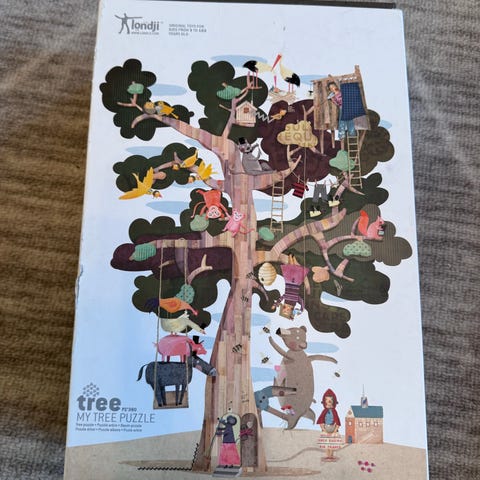 Geometrisk puslespill i tre for barn. Settet består av flere brett med motiver som tog, brannbil og drage, der barnet legger fargede geometriske brikker i utskårne former. Inneholder ulike former og farger som sirkler, trekanter, rektangler og ovaler. Brett og brikker er laget i tre med malt overflate. Egnet som aktivitetsleke for barn til øving på form- og fargegjenkjenning og finmotorikk.
