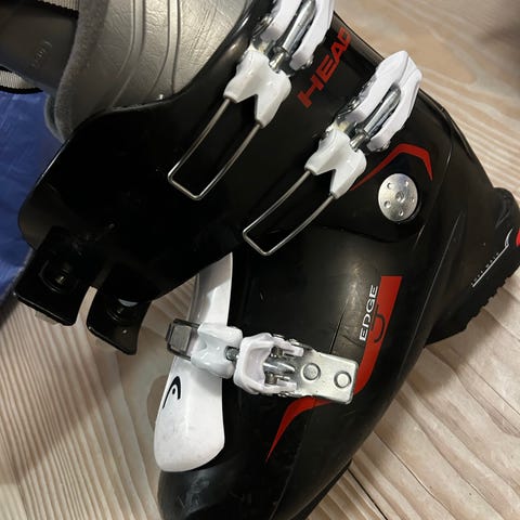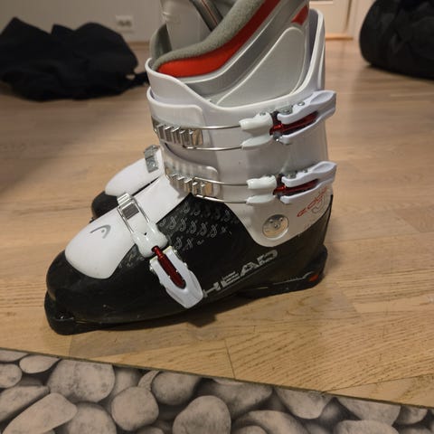 Head Edge alpinstøvler i hvit og svart med røde detaljer. Støvlene har tre justerbare spenner. Modellen har hard ytterskall og polstret innerstøvel for støtte og komfort ved alpinkjøring.