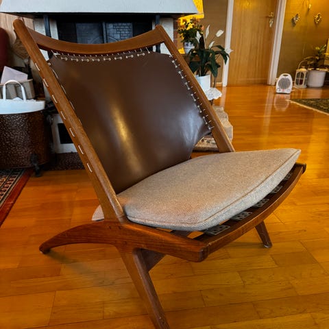 Dette er en lenestol i tre med brunt skinnsetetrekk. Den har en høy ryggstøtte og buede armlener i en stil som minner om skandinavisk design fra midten av århundret. Denne stolen er en retro lenestol fra 1960-tallet, ofte utført i teak med trekk av kunstskinn (skai) eller skinn. Den kjennetegnes av sin karakteristiske høye rygg og organiske armlener i tre, som er typisk for skandinavisk mid-century moderne design. - ifølge AI