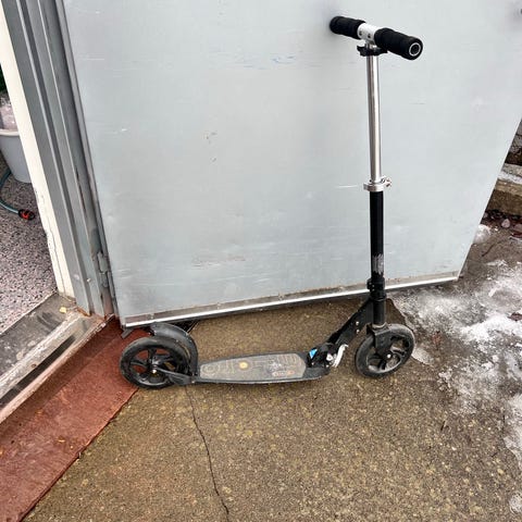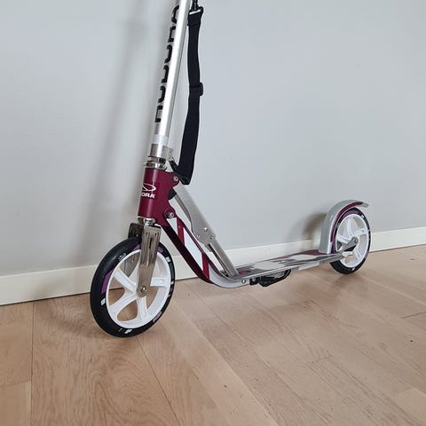 Sammenleggbar sparkesykkel i hvit farge med blå hjul. Modellen har stort for- og bakhjul for stabil kjøring og et lavt ståbrett. Styret er teleskopisk og kan justeres i høyden. Egnet til bruk på jevnt underlag, for eksempel asfalt og gangveier. Passer til både barn og ungdom. Jeg husker ikke hvordan man får den opp men det tror jeg du greier om du er sterkere enn meg dersom det er lenge siden den har blitt tatt i bruk.