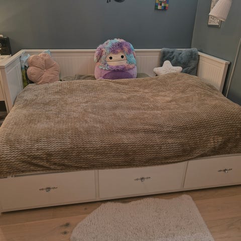 Fin brukt seng, kan gjøres om til dobbelt seng. Farge hvit med 2 madrasser, 3 skuffer som har mye plass til barneleker eller klær. Kjøpt fra ikea. Pris som ny ca. 5000