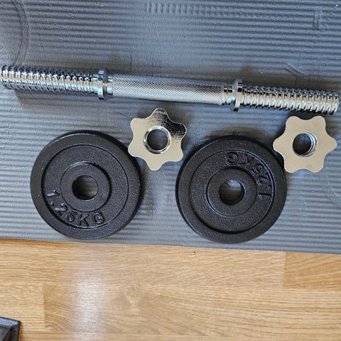 Manual justerbar manualsett med vektskiver i metall og plast/belegg. Settet består av en rett manualstang med grep i metall og flere runde vektskiver som kan tas av og på etter behov. Vektskivene festes med skrulås. Egnet til styrketrening av overkropp, armer og skuldre hjemme eller på treningsrom. Passer for voksne brukere uavhengig av kjønn.