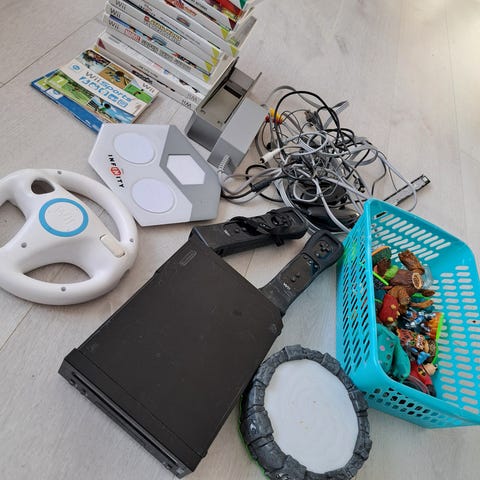 Svart Nintendo Wii med spill og kontrollere. Utstyr som kabler, kontrollere og spill medfølger. Alt sammen fungerer som det skal. Her får man det man trenger for å spille på Wii. Nintendo wii revolusjonerte trådløs motion controller for spillkonsoller slik som sin etterkommer Nintendo Switch.