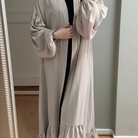Størrelser: Du kan velge mellom 54, 56 og 58. Send meg melding for en detaljert størrelses guide. Alle størrelsene er oversized, som klassiske abayaer. Er du usikker på størrelse, kan du velge den større for lengre lengde og enda løsere passform, eller den mindre for kortere lengde og noe smalere fasong.