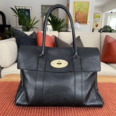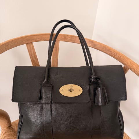Mulberry skinnveske for dame i svart lær. Vesken har doble hanker for bæring i hånden eller over skulderen. Den lukkes med karakteristisk metallås i gullfarge på fronten. Laget i strukturert skinn med enkel sømdetalj på baksiden. Innvendig hovedrom egnet til daglig bruk, med plass til personlige eiendeler som lommebok, mobil og småting. Passer som hverdagsveske eller jobbveske for dame. Kjøpt på Selfridges i London. Kvitteringen har dessverre forsvunnet i flytting.