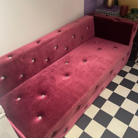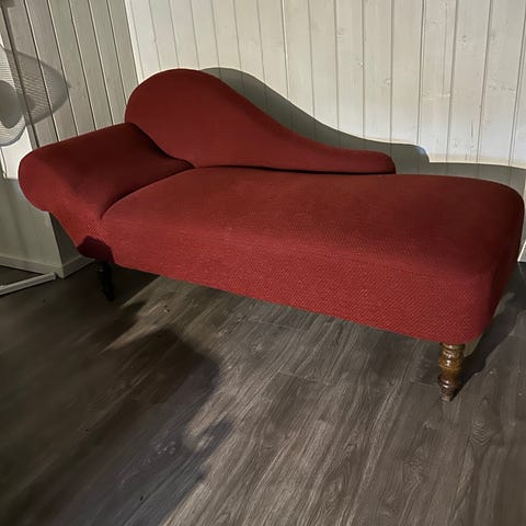 Rød sjeselong i stoff. Møbelet har en klassisk form med høy rygg og armlene på én side, samt knappestikninger i ryggen. Trekk i rødt tekstil med myk overflate. Sjeselongen står på fire ben og er egnet som liggesofa eller ekstra sitteplass i stue, soverom eller oppholdsrom.