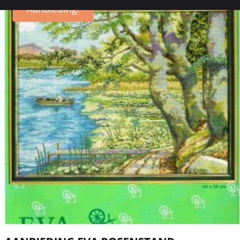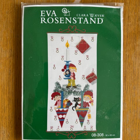 Eva Rosenstand broderisett med motiv av kobberkanne med blomster. Settet inneholder broderiduk med påbegynt broderi, mønsterark og broderigarn i ulike farger. Motiv og fargeanvisninger vises på mønsterarket, og siste bilde viser et eksempel på ferdig broderi av samme motiv. Egnet til veggbilde eller innramming etter eget ønske.
