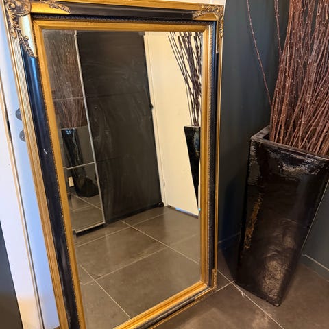 nydelig, fasettslipt speil i gull og svart farget treramme.