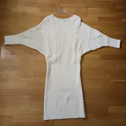 Kjolen er pent og lite brukt. Str. XL, men liten i størrelsen. Passer nok bedre som str. M eller liten L. Brystmål ustrukket fra armhule til armhule er 43 cm, og hel lengde fra skulder og ned er 105 cm. Kjolen er i 80% viskose, 18% polyamid og 2% elastan.