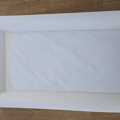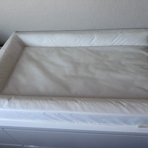 IKEA Vädra stellematte i hvit farge. Rektangulær stellematte med opphøyde kanter rundt sidene. Overflaten er glatt og kan tørkes av. På bildene vises også to ulike trekk som kan brukes utenpå stellematten og som følger med. Egner seg til bruk på stellebord eller annen stabil overflate ved stell av baby.