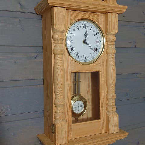 Gulvklokke i tre med pendel og mekanisk urverk. Klokken har glassdør i front som viser pendel og vekter, samt dekorert urskive øverst. Egner seg som innredningselement i stue, gang eller andre oppholdsrom der man ønsker en tradisjonell, frittstående klokke på gulv.