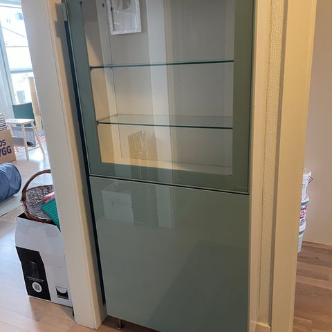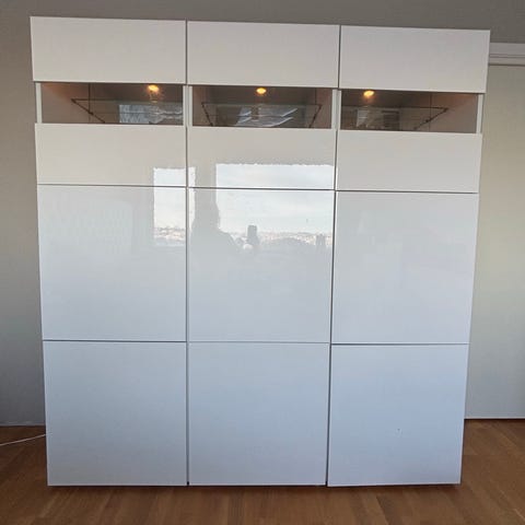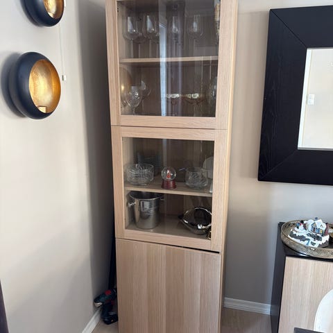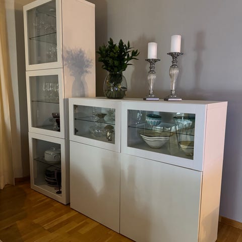 Selger to 2 stk BESTÅ IKEA Oppbevaringskombi med vitrinedører, hvitbeiset eikemønster.