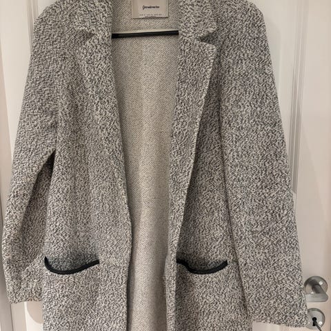 Stradivarius kåpe for dame i størrelse S. Kåpen er beige og laget i polyester. Modellen har åpen front uten synlig lukking, med krage og slag. Den har lange ermer og to skrålommer foran. Lengden går ned over hoftene. Passer som ytterplagg i overgangssesonger eller milde vinterdager.