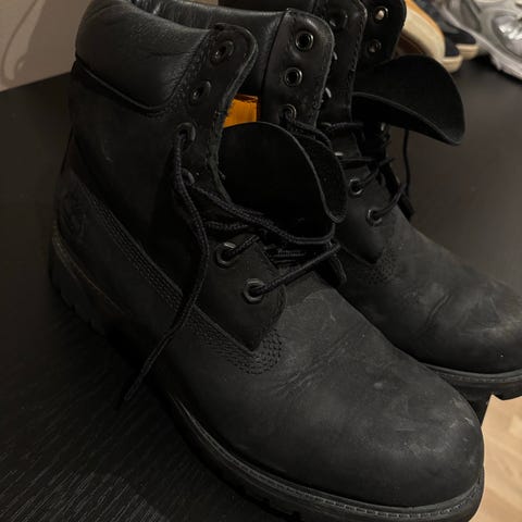 Timberland støvler i størrelse 41. Modellen er i svart skinn/nubuk med snøring og kraftig såle. Støvlene har polstret ankelparti og karakteristisk Timberland-logo på siden og på hengende merke. Innside i kontrastfarge. Egnet som hverdagssko og til bruk i kjøligere og våtere værforhold.