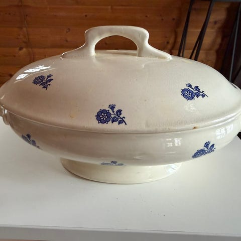 Sausenebb fra Egersund Fayance, blå blomst med gullkant. Noen få krakeleringsstriper på fatet (se bilder), men fremstår som pent. Hel og pen dekor og gullkant. Pakker svært godt ved sending