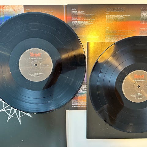 Dobbel LP-utgave av albumet «Death Magnetic» fra Metallica. Utgivelsen består av to svarte vinylplater med trykte etiketter, levert i utbrettcover (gatefold) med bandfoto og trykte tekster på innsiden. Baksiden av coveret viser låtlisten for albumet. Passer for avspilling på standard platespiller for 12" vinyl.