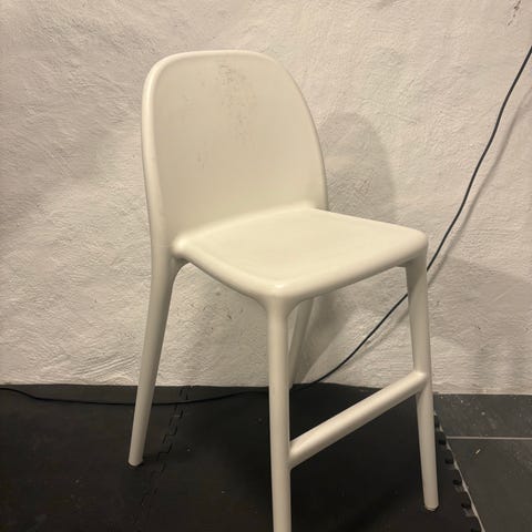 IKEA høy barnestol i hvit farge. Den er utstyrt med sikkerhetssele og låsemekanisme på baksiden. Egnet som spise-/matstol for små barn ved bord. Stolen er sammenleggbar og kan enkelt flyttes og oppbevares når den ikke er i bruk.