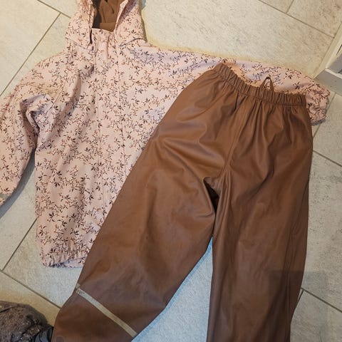 CeLaVi regnsett for barn i størrelse 110, unisex. Sett med jakke og bukse i polyester. Jakken har hette og mønster med figurer, samt glidelås foran. Buksen er ensfarget brun med strikk nederst i beina og fotstrikker. Setter er foret med fleece. Passer som yttertøy i vått vær for barn rundt størrelse 110.