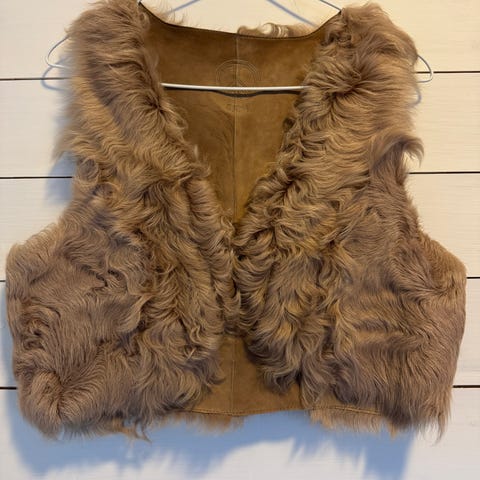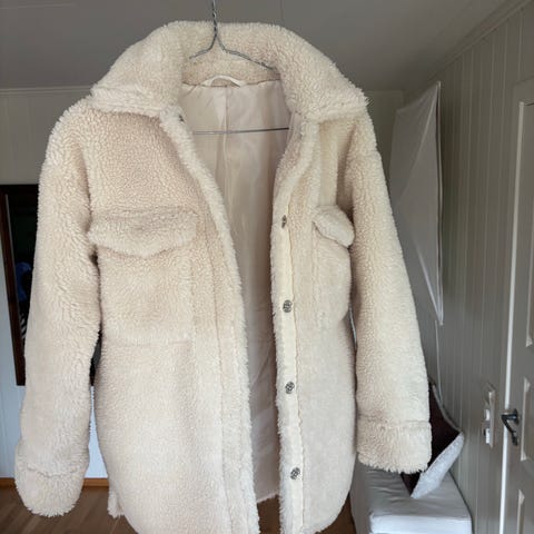 Fuskepels for barn i størrelse 116 cm. Jakken har lang, myk fuskepels i beige og gråtoner og er foret på innsiden. Passer til barn rundt 6 år, str 116.