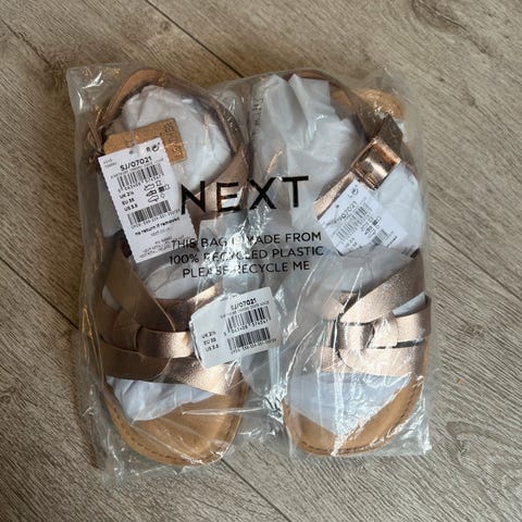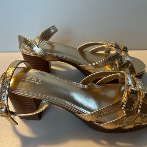Next Signature sandaler i størrelse 37. Modellen har brun overdel med preget mønster og åpen tå. Justerbar rem med spenne rundt hælen. Kraftig såle med platå og hæl for ekstra høyde. Passer til bruk i vår- og sommersesongen. Brukt en gang.