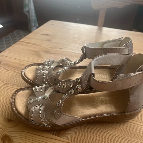 Sandalene er i en beige/brun nyanse med glitrende remmer og blomsterdetaljer med dekorative perler foran. Overdelen har flere kryssende remmer og hælrem med strikk. Kilehælen har flettet struktur. Egnet som sommersandaler til hverdagsbruk eller penere anledninger.