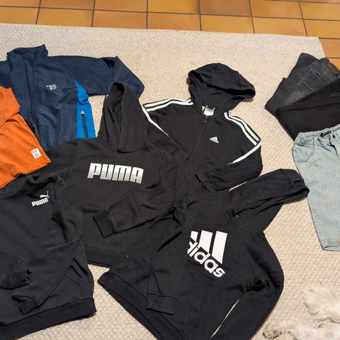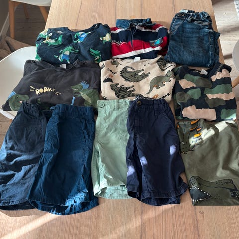 Klespakke til gutt. Det meste er i størrelse 128. Noen av klærne er i god stand, andre er mer brukt.