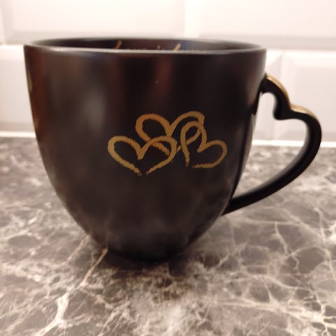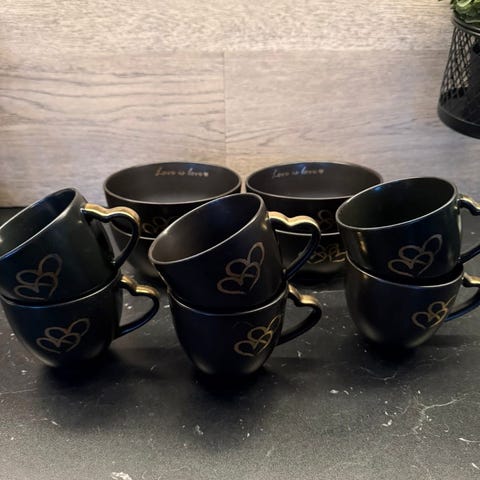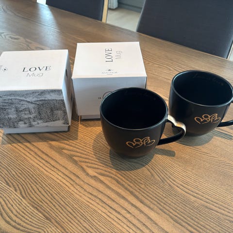 Krus i svart porselen med gullfargede hjerter på utsiden og teksten «Love is love» på innsiden av kanten. Hanken er formet som et hjerte med gullfarget detalj. Volum ca. 80 cl, egnet til varme og kalde drikker. Designet av Jan Thomas for Magnor Glassverk.