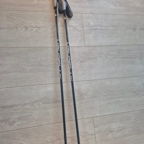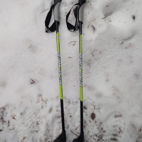 Fischer sprint skistaver i gul og svart farge. Staver med håndstropper og trinser nederst.