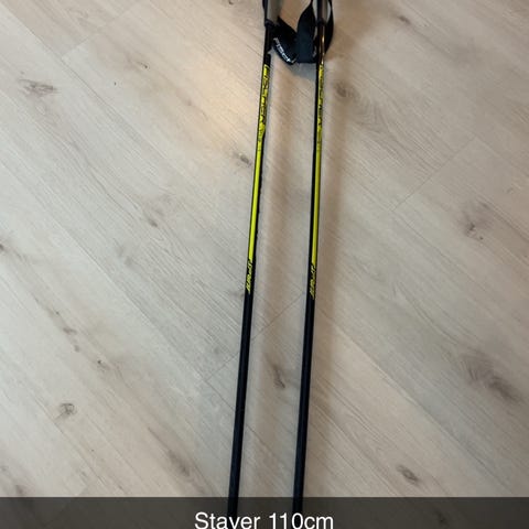 Selger skistaver med lengde på 120 cm. Passer til langrenn eller turbruk. Fargekombinasjon med mørk stamme og detaljer i gult. Hentes på Tiller.