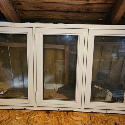 Gammelt vindu med ruter og varevindu.Mål B-116cm H-119cm.
