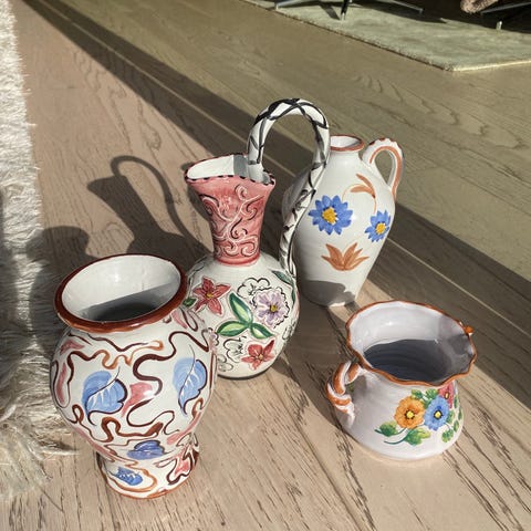 Veggmontert keramisk vannbeholder med tilhørende skål i hvit farge med blå blomsterdekor. Beholder og skål er festet på en treplate. Øvre del har lokk og tapp for tapping av vann eller annen væske, nedre del fungerer som oppsamlingsskål eller beholder. Passer som dekorativt bruksobjekt på kjøkken eller i andre rom der man ønsker en tradisjonspreget veggdekor i keramikk og tre.
