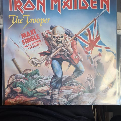 Iron Maiden The Trooper vinylbildeplate 12". Utgivelsen er en rund bildeplate med motiv fra The Trooper-coveret på begge sider. Formatet er 12-tommers vinylsingle/EP. Leveres med omslag som har tilsvarende illustrasjon og trykt informasjon om låtene på baksiden. Egnet for avspilling på platespiller som støtter 12" vinyl, og kan også brukes som samler- eller utstillingsobjekt.